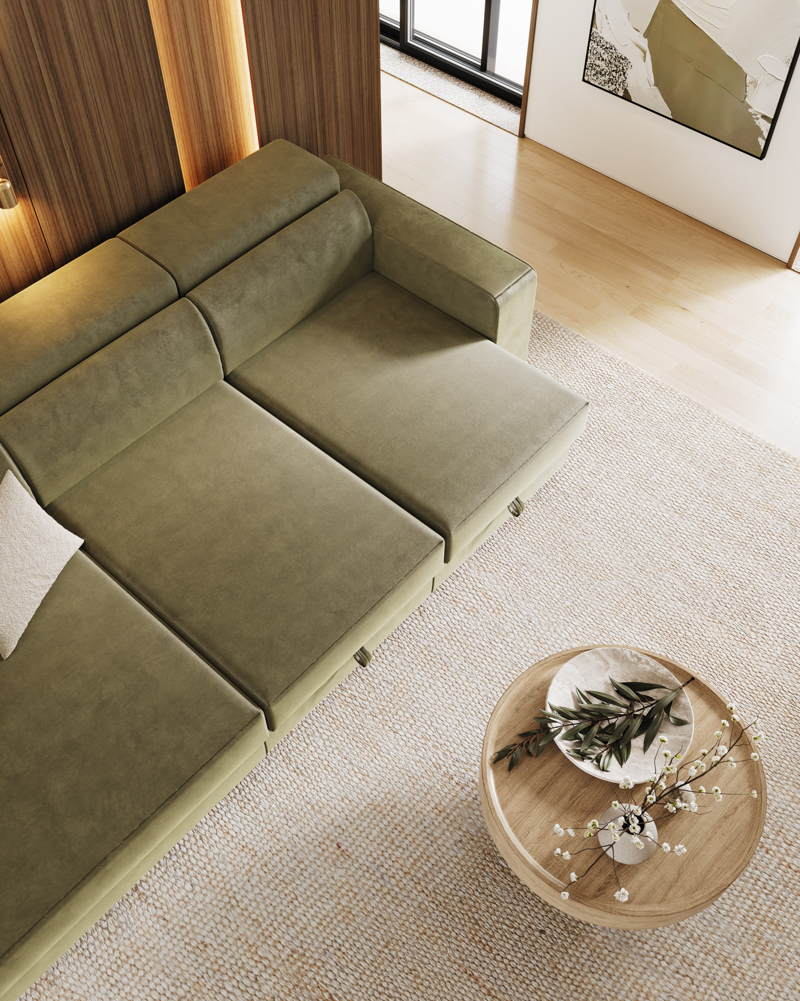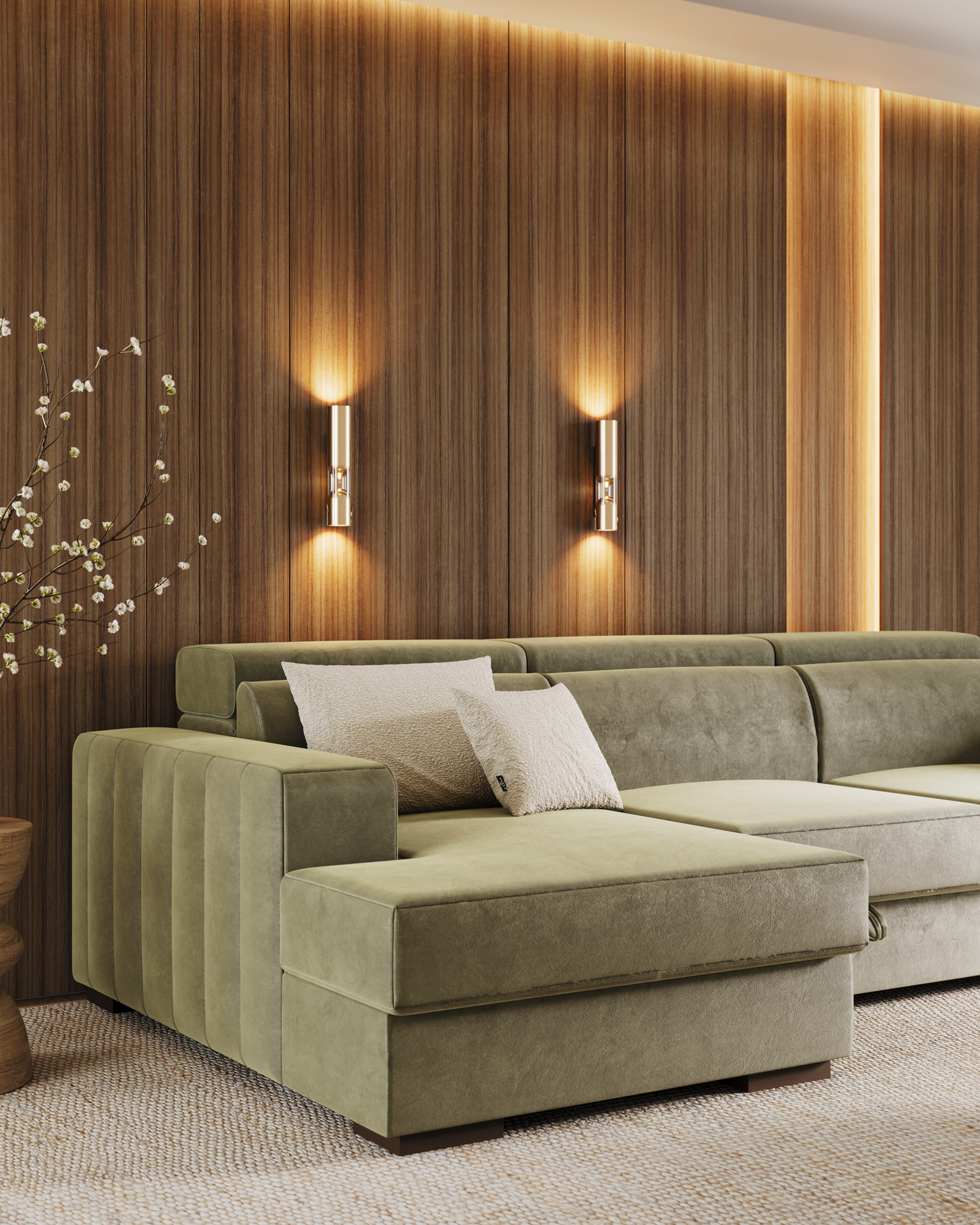 Design with chaise on the left side and sliding seats that convert into a sofa bed. Upholstered in elegant green fabric, with a solid base and sturdy frame for comfort and durability. Ideal for maximising space and versatility in contemporary living rooms.